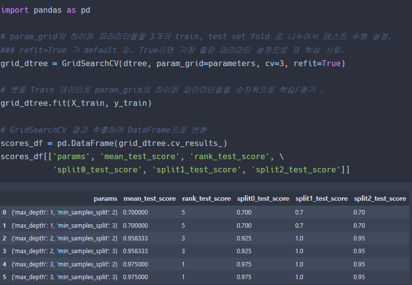 위의 결과에서 총 6개의 결과를 볼 수 있으며, 이는 하이퍼 파라미터 max_depth와 min_samples_split을 순차적으로 총 6번 변경하면서 학습 및 평가를 수행했음을 나타낸다.