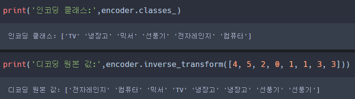 또한 inverse_transform()을 통해 인코딩된 값을 다시 디코딩할 수 있다.
