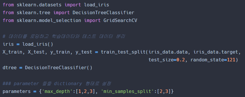 테스트할 하이퍼 파라미터 세트는 딕셔너리 형태로 하이퍼 파라미터의 명칭은 문자열 Key 값으로, 하이퍼 파라미터의 값은 리스트 형으로 설정한다.