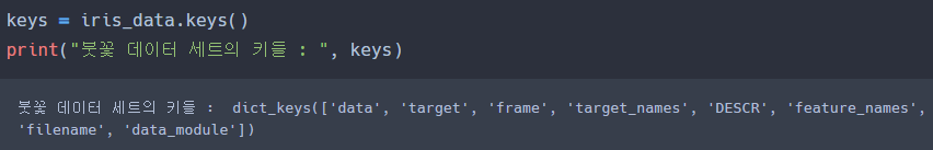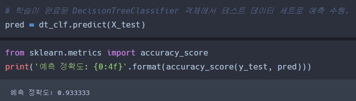 - 예측 수행 : 학습된 ML 모델을 이용해 테스트 데이터의 분류(즉, 붓꽃 종류)를 예측한다.