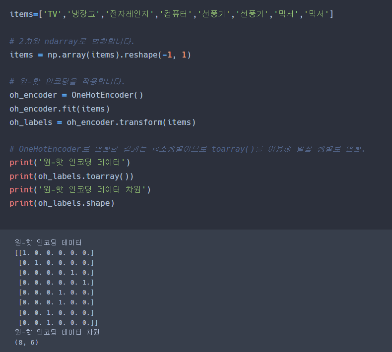 원-핫 인코딩은 사이킷런에서 OneHotEncoder 클래스로 변환이 가능하다.