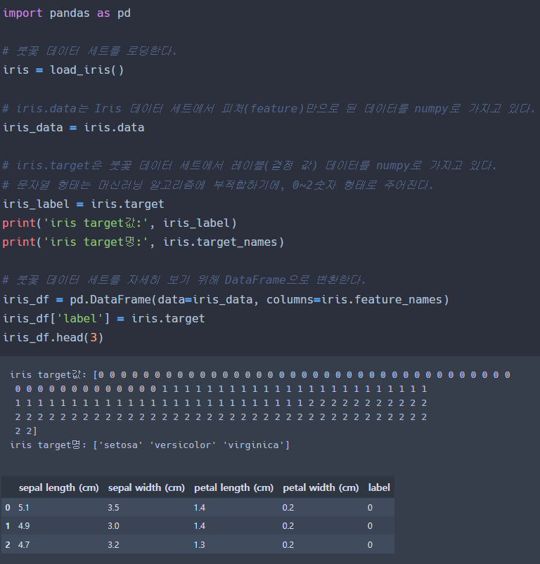 레이블은 0, 1, 2 세 가지 값으로 돼 있으며, 0이 Setosa 품종, 1이 versicolor 품종, 2가 virginica 품종이다.
