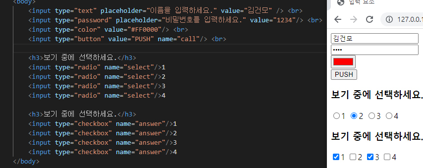 radio와 checkbox 속성에 name을 붙이면 하나의 문제가 되고, 각 요소들은 선택지가 된다.