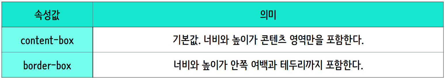• box-sizing 속성은 너비와 높이가 포함할 영역을 변경함으로써 너비와 높이 의 계산 방법을 결정할 수 있다.