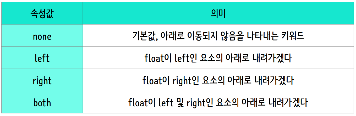 clear 속성은 float 요소 이후에 표시되는 요소가 float을 해제(clear)하여 float 요소의 아래로 내려가게 할 수 있다.